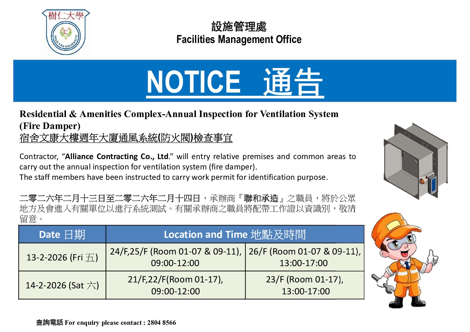 Notice -Annual inspection for Ventilation system (Fire Damper)